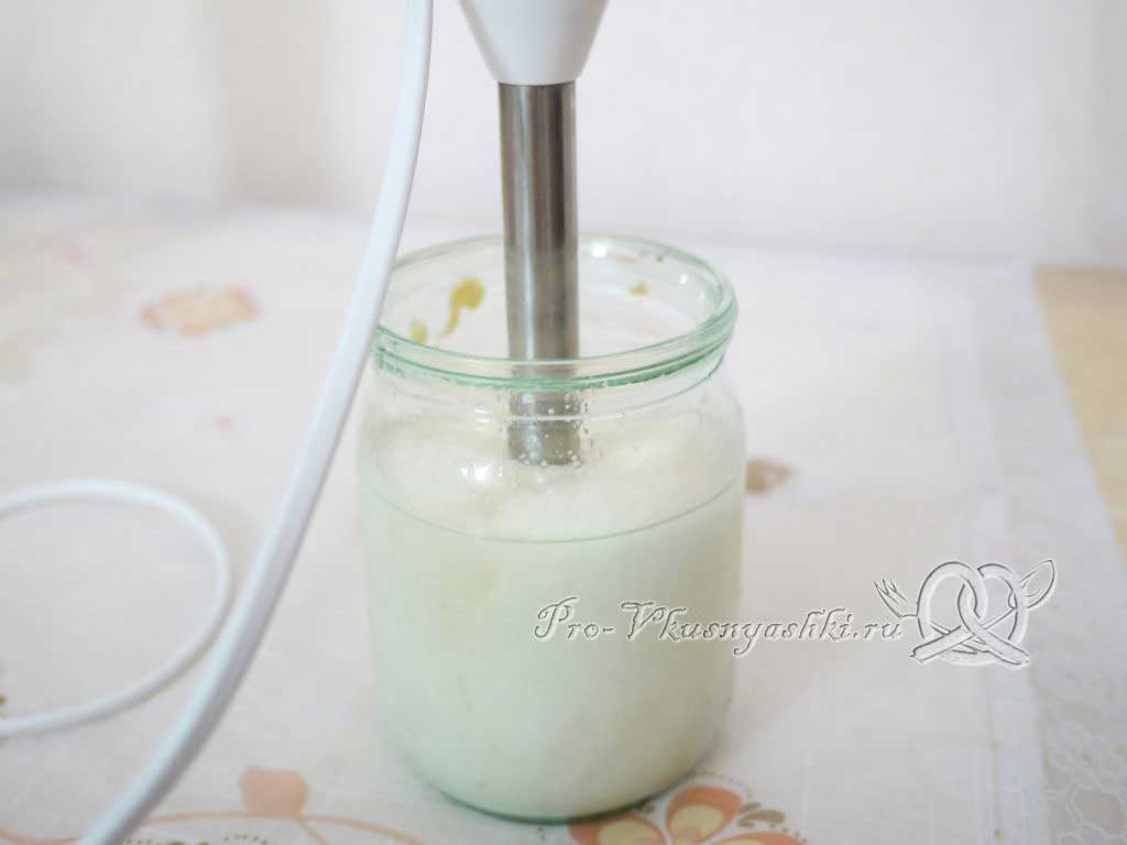 Ставим на дно банки погружной блендер и, не двигая его, начинаем взбивать наши ингредиенты до образования стойкой эмульсии.
