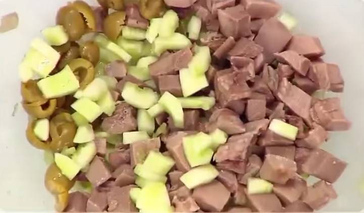 14. Оливки (без косточек) нарезаем пополам и добавляем к салату.