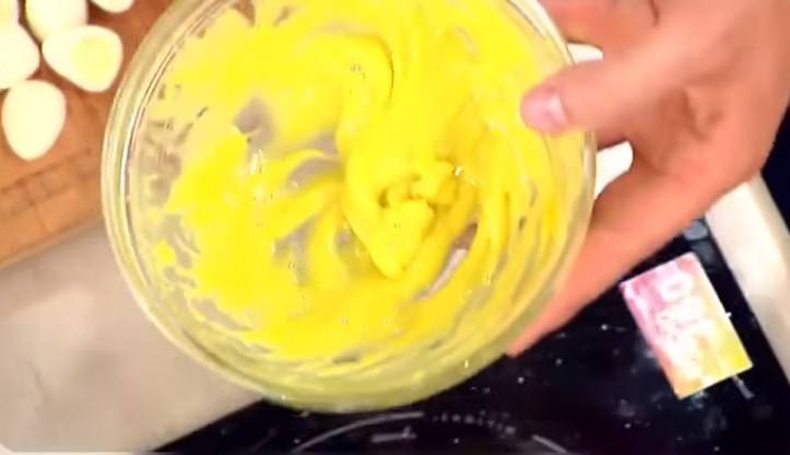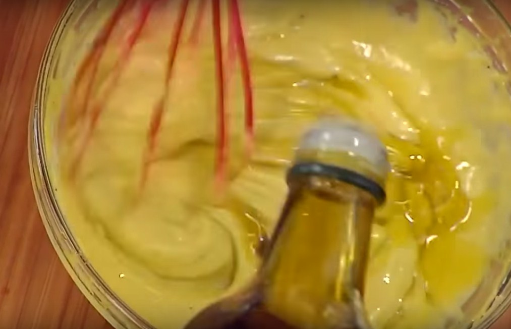 Постепенно добавляем оливковое масло (понемногу), горчицу, лимонный сок, соль и перец.