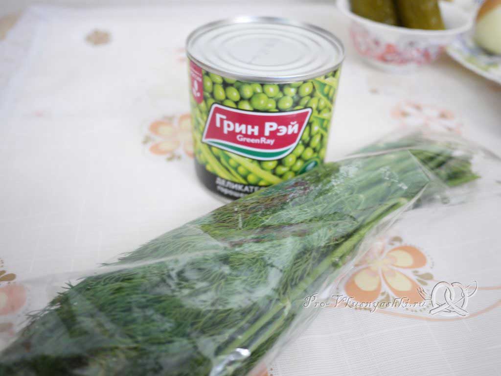 Подготовим ингредиенты. Овощи, зелень и фрукты моем. С консервированного зеленого горошка сливаем воду.