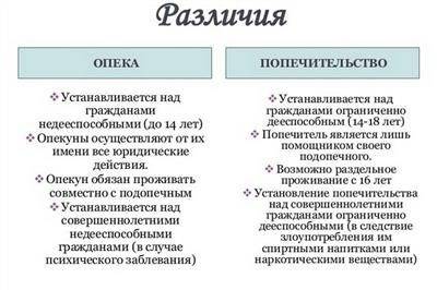 Несмотря на то что эти понятия близки по смыслу, в некоторых моментах они имеют серьезные отличия. Так как опекун выполняет роль родителя, почти все вопросы он решает самостоятельно. Попечитель — наставник, который помогает в решении различных сложностей и повседневных проблем.