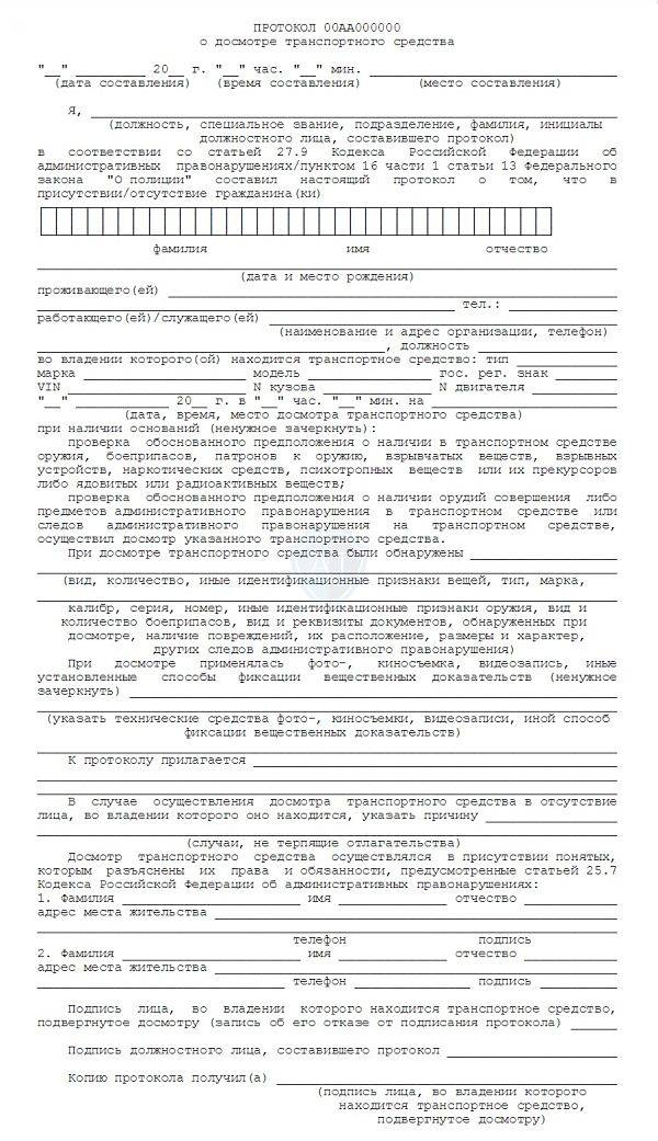 - Далее составляется протокол досмотра. Если ранее составлен протокол задержания водителя, то запись о процедуре делается прямо в нём.