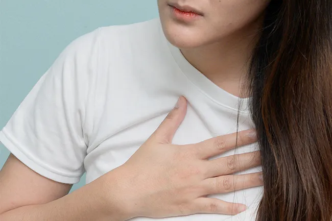 Во время кашля мокроты нет либо она отходит в малом количестве, имеет коричневатый оттенок. Из-за одышки сделать полноценный вдох не получается. Частота дыхания около 22 движений за минуту. Человек испытывает ощущение нехватки воздуха, характерное для пневмонии при коронавирусе. Максимально проявляется этот симптом в период с 6 по 9 день с момента заражения