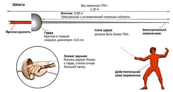 - Шпага отличается трехгранной формой клинка и массой до 0,77 кг. Правила допускают нанесение уколов во все части тела.