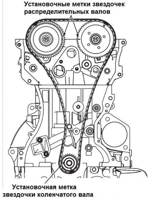 Потому перед снятием старой нужно таковые метки обозначить самостоятельно. Отметки на звездочках распределительных валов отмечены специальными пометками на картинке: