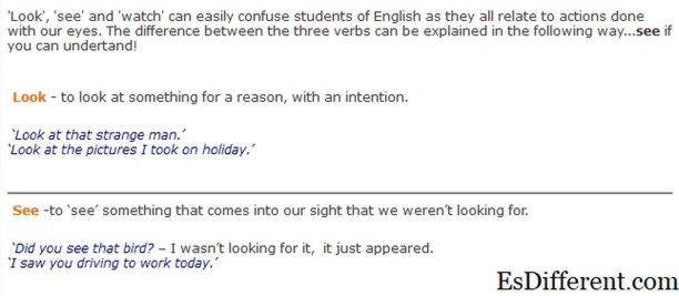Глагол see (видеть) используется, чтобы обозначить способность зрения. Он может описывать активность, которая происходит без специального намерения или усилий. Глагол see может использоваться для описания физического восприятия, без различия, есть ли у нас намерение смотреть или нет. Например: