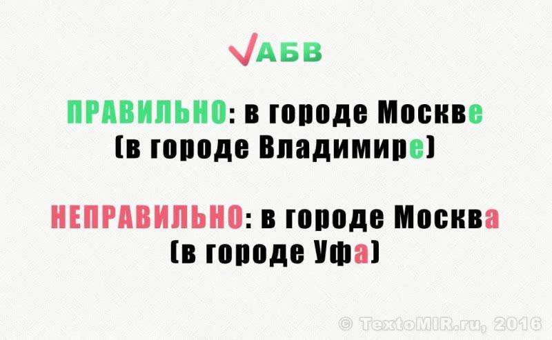Таким образом, правильно писать: в городе Москве или в г. Москве. То же самое относится и к другим городам – правильно пишется: в городе Санкт-Петербурге, в городе Орске, в городе Владимире.
