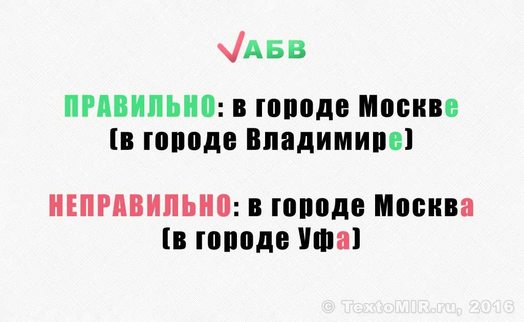 Таким образом, правильно писать: в городе Москве или в г. Москве. То же самое относится и к другим городам – правильно пишется: в городе Санкт-Петербурге, в городе Орске, в городе Владимире.