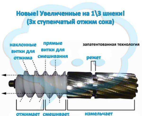 Шнековое устройство работает на небольших оборотах. Ускорять процесс возможности не имеется. Центробежная сила не действует на процесс выдавливания сока.