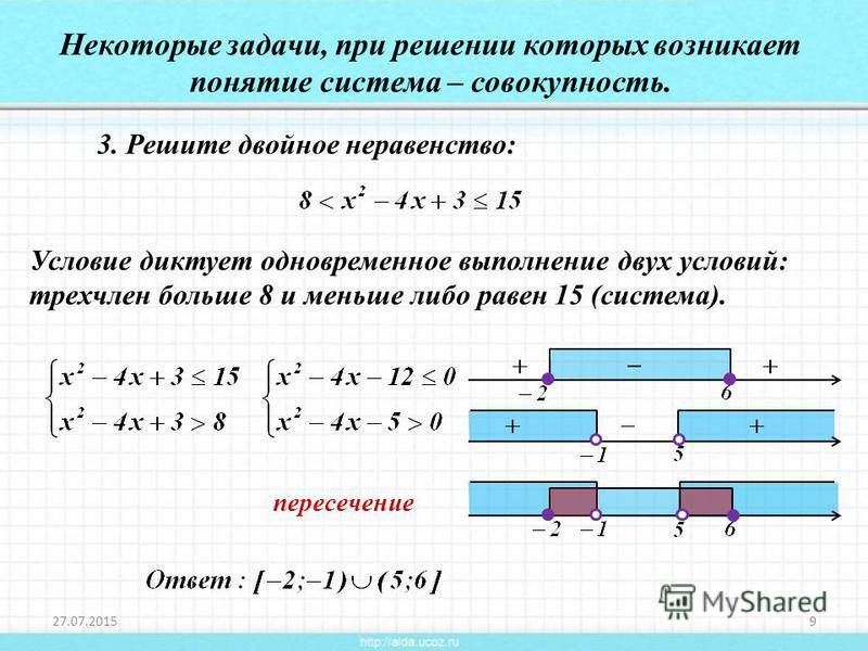 Решите двойное неравенство: Некоторые задачи, при решении которых возникает понятие система – совокупность. Условие диктует одновременное выполнение двух условий: трехчлен больше 8 и меньше либо равен 15 (система). пересечение