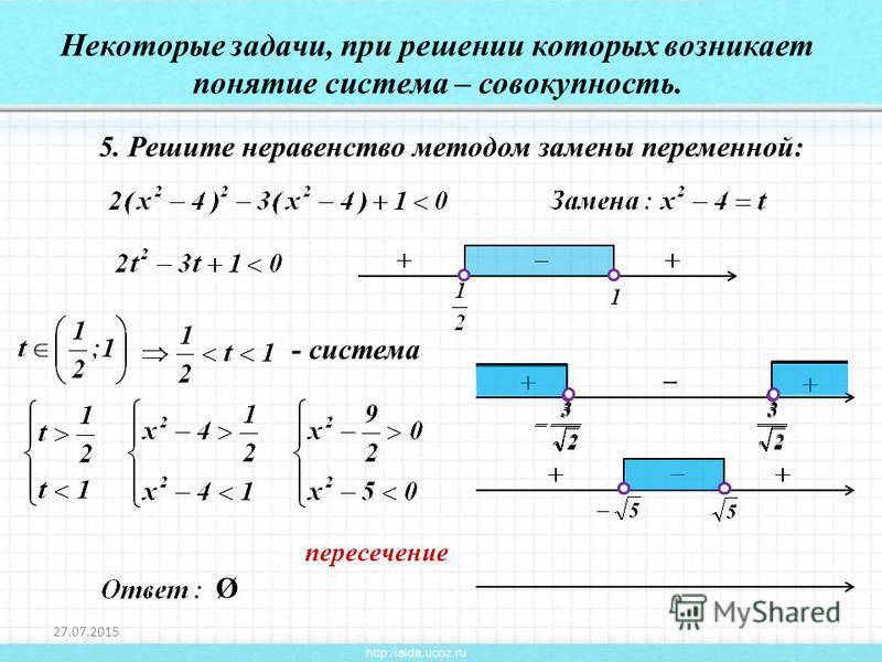 Решите неравенство методом замены переменной: Некоторые задачи, при решении которых возникает понятие система – совокупность. – система Ø пересечение
