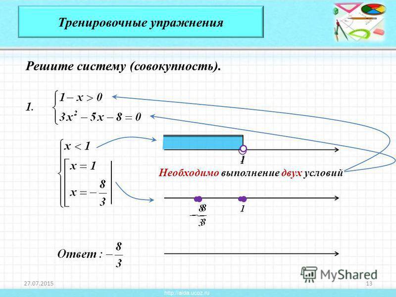 Тренировочные упражнения Решите систему (совокупность). Необходимо выполнение двух условий
