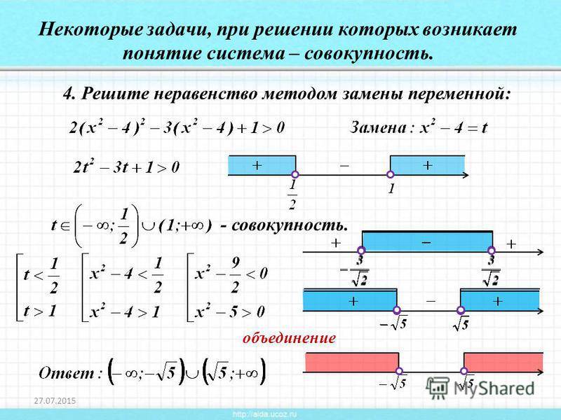 Решите неравенство методом замены переменной: Некоторые задачи, при решении которых возникает понятие система – совокупность. – совокупность. объединение