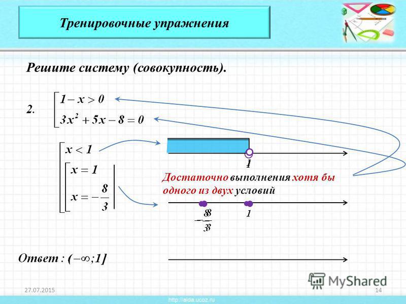 Тренировочные упражнения Решите систему (совокупность). Достаточно выполнения хотя бы одного из двух условий