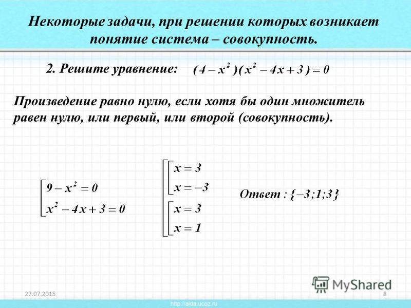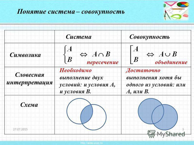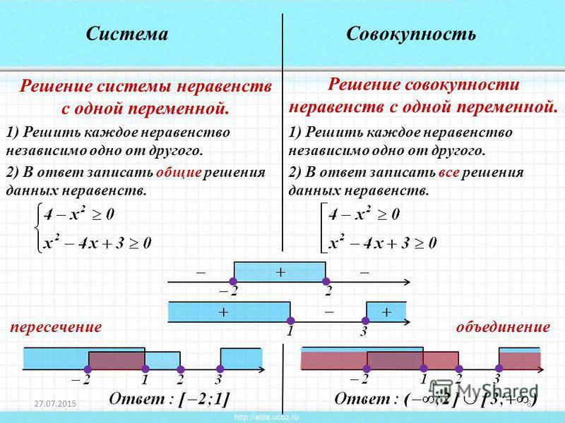 Имеет смысл рассматривать, к примеру, совокупность уравнения и 2-ух неравенств, неравенства и системы уравнений, совокупность 2-ух систем неравенств и т.п. При этом основное хранить смысл, заключающийся все вместе, — она значит много решений, являющихся решением хотя бы одного объекта совокупности.