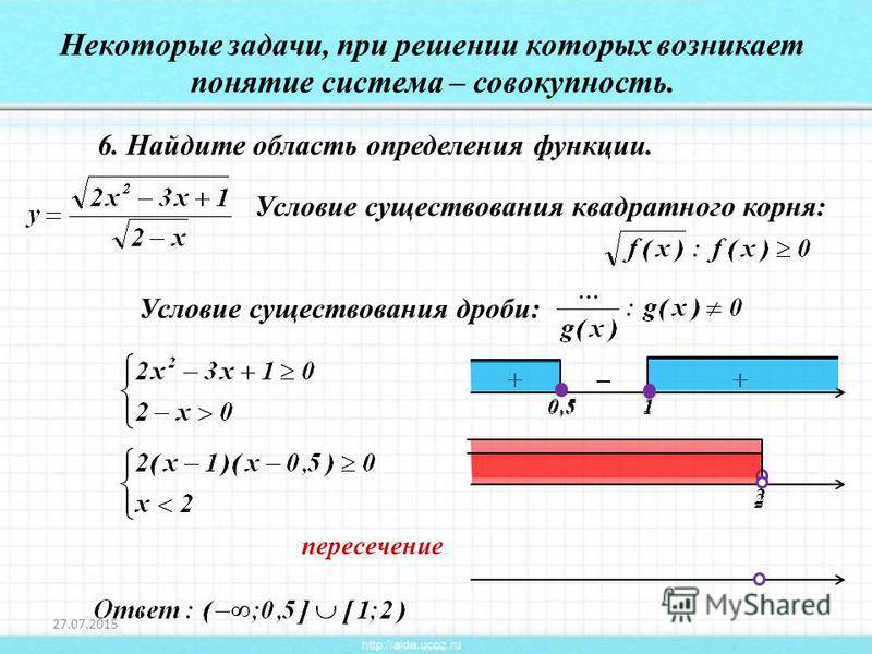 Найдите область определения функции. Некоторые задачи, при решении которых возникает понятие система – совокупность. пересечение Условие существования квадратного корня: Условие существования дроби: