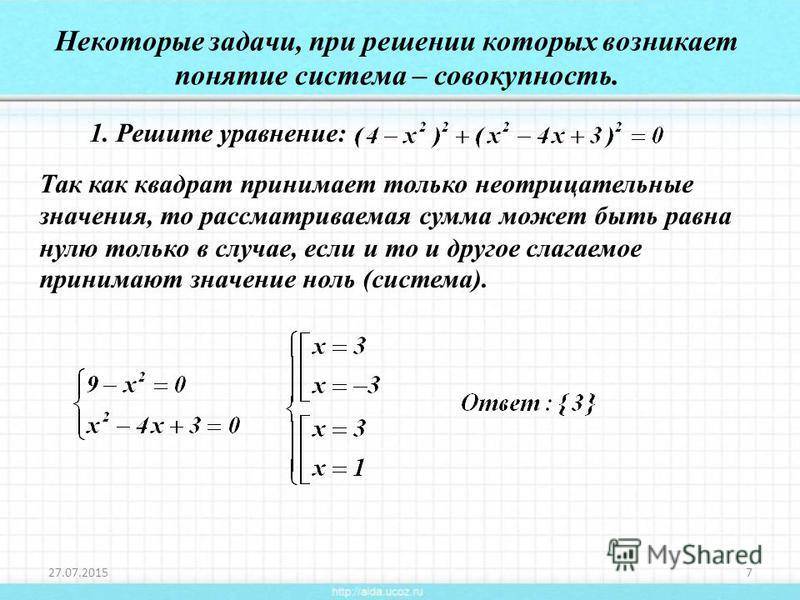 Решите уравнение: Некоторые задачи, при решении которых возникает понятие система – совокупность. Так как квадрат принимает только неотрицательные значения, то рассматриваемая сумма может быть равна нулю только в случае, если и то и другое слагаемое принимают значение ноль (система).
