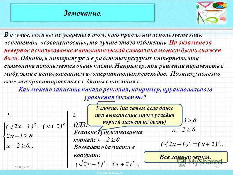 Замечание. В случае, если вы не уверены в том, что правильно используете знак «система», «совокупность», то лучше этого избежать. На экзамене за неверное использование математической символики может быть снижен балл. Однако, в литературе и в различных ресурсах интернета эта символика используется очень часто. Например, при решении неравенств с модулями с использованием альтернативных переходов. Поэтому полезно все – же ориентироваться в данных понятиях. Как можно записать начало решения, например, иррационального уравнения (экзамен)? ОДЗ: Условие существования корней: Возведем обе части в квадрат: Условно. (на самом деле даже при выполнении этого условия корней может не быть) Все записи верны.