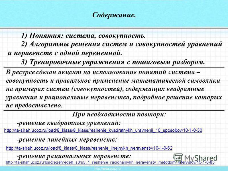 1) Понятия: система, совокупность. Содержание. 2) Алгоритмы решения систем и совокупностей уравнений и неравенств с одной переменной. 3) Тренировочные упражнения с пошаговым разбором. В ресурсе сделан акцент на использование понятий система – совокупность и правильное применение математической символики на примерах систем (совокупностей), содержащих квадратные уравнения и рациональные неравенства, подробное решение которых не предоставлено. При необходимости повтори: -решение квадратных уравнений: -решение линейных неравенств: -решение рациональных неравенств: