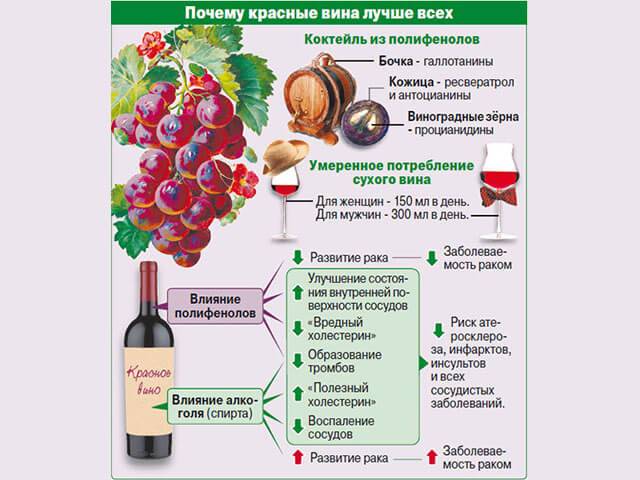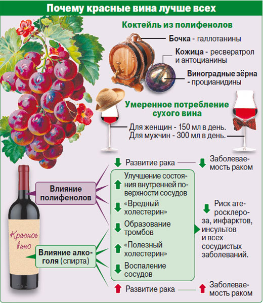 Отличается напиток по структуре, в нем имеется ресвератрол — это вещество, снижающее возможность ухудшения слуха, объем холестерина в крови, риск появления раковых опухолей. Если употреблять напиток периодически в небольшом объеме, можно: