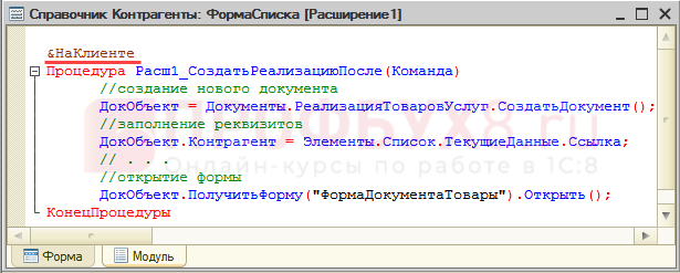 Программный код реализован на платформе 1С:Предприятие 8.3.17.1549. По заданию после нажатия кнопки должен быть создан новый документ и открыта его форма с частично заполненными реквизитами.