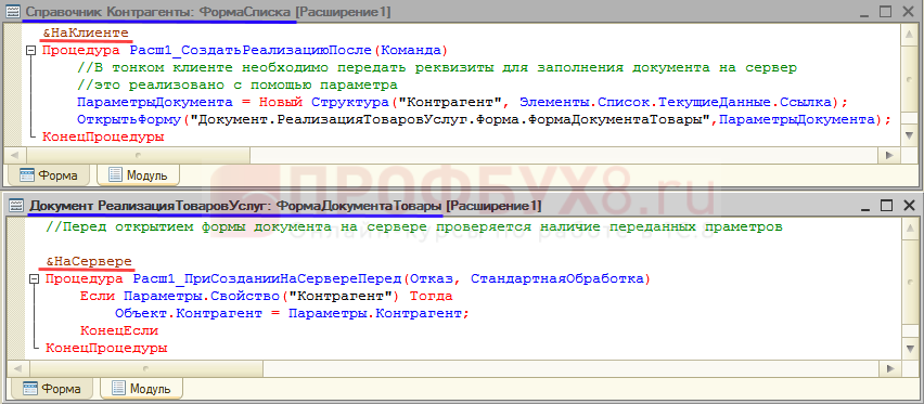После создания тонкого клиента программный код всегда разделяют на клиентскую и серверную части. И хотя структура клиент-сервер была заложена в платформу с версии 8.0, строгого деления кода тогда не требовалось, т. к. существовал только один режим клиентского приложения — аналог толстого клиента — и возможности были одинаковы на сервере и на стороне клиента.