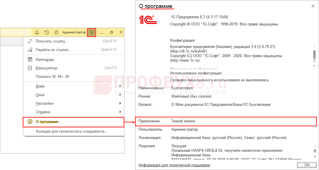 Если конфигурация работает на управляемых формах, например, 1С:Бухгалтерия предприятия 3.0, то система запустится в режиме тонкого клиента. Уточнить режим можно в запущенной программе 1С: Сервис и настройки — О программе, в открывшемся информационном окне раздел Приложение.