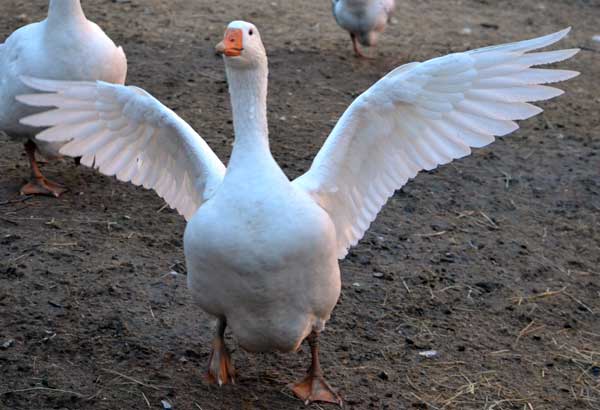У гусей длинная красивая шея, придающая птице величественный вид. К сожалению, такой размер не позволяет ей делать глубокие нырки. Клюв по цвету такой же, как лапы — оранжевый. На его поверхности находится маленький ноготок. Зубы у пернатого острые. С их помощью он легко выдергивает из земли растительную пищу. Гусь – птица шумная. Его гогот громкий, трубный. При появлении опасности шипит.