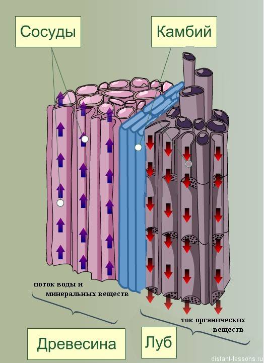 Глубже лежит луб (флоэма) — проводящая ткань, по которой осуществляется нисходящий ток органических веществ.