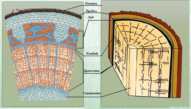 Это запасающая ткань, в которой складируется крахмал — питательное вещество растений. В результате активности клеток камбия закладываются вторичные ксилема и флоэма, постепенно стебель утолщается. Вторичной ксилемы всегда больше, чем вторичной флоэмы. В дальнейшем первичный покров (эпидерма) сменяется пробкой, образуемой феллогеном (пробковым камбием), откладывающим снаружи феллему (или пробку), а внутрь — феллодерму (пробковую кожицу).