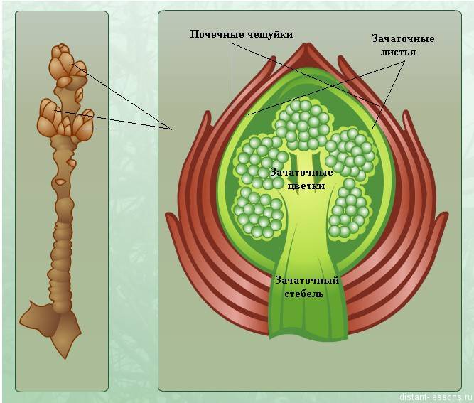 Генеративные почки обычно крупнее вегетативных. Их верхушка во многих случаях более округлая, чем у вегетативных зачатков.