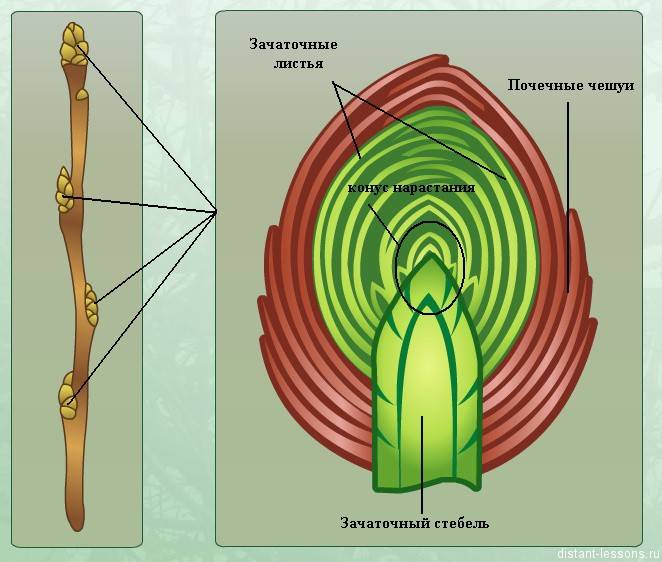 Снаружи она защищена чешуйками — плотными видоизменениями листьев. У многих растений чешуйки покрыты или пропитаны смолянистым веществом — для лучшей защиты и удержания влаги.