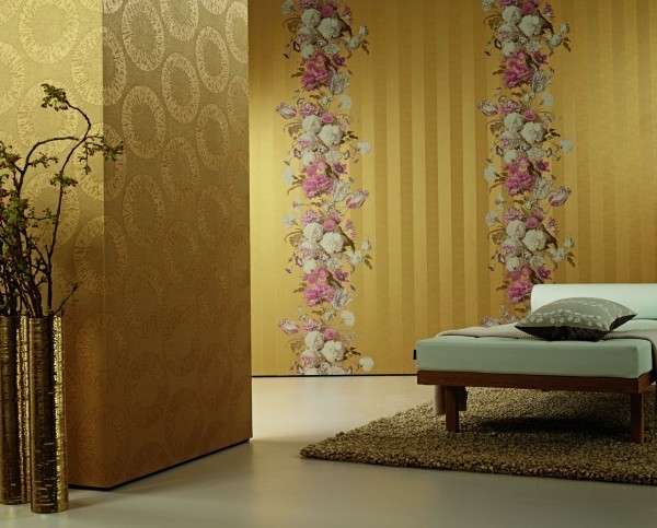 Основой данных обоев являются бумага либо флизелин. В качестве декоративного покрытия служит алюминиевая фольга. Металлизированные обои применяются для оформления элитных интерьеров залов. Их блестящая поверхность способствует визуальному расширению параметров помещения. Это свойство особо необходимо для тесных гостиных. Важным достоинством данных покрытий является способность отражать электромагнитное излучение. То есть помещение надежно защищено от проникновения электромагнитных лучей извне.