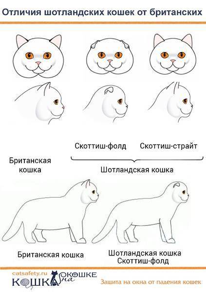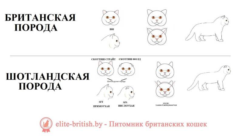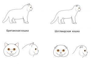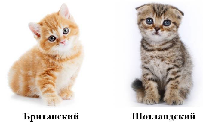| Британские коты бывают только прямоухими | Шотландские коты бывают: — скоттиш стайт (прямоухие) — скоттиш фолд (вислоухие) |