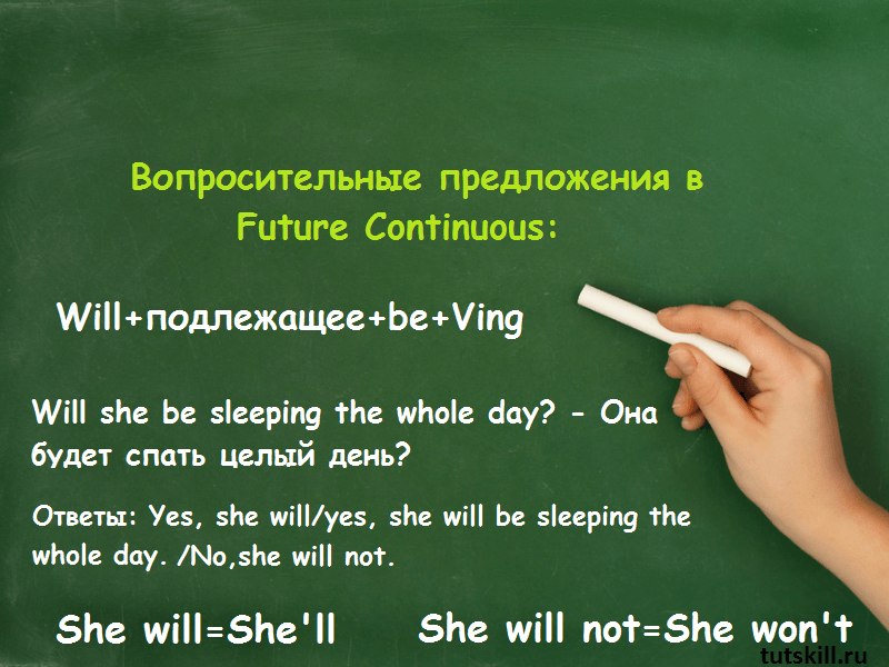 | Пример: I will help you with your homework. (Предложение) | Пример: He will be working all day tomorrow. (Описание будущих действий) |
