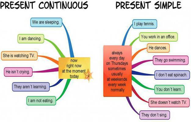 Также нам нужно использовать время Present Simple,Настоящее простое когда мы говорим факты о ком-либо/чём-либо или общеизвестные факты. В свою очередь, Present ContinuousНастоящее продолженное будет обозначать действия, которые происходят и длятся, но необязательно в момент речи.