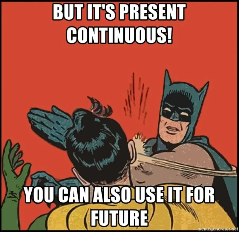 Чтобы правильно что-то сказать в этом времени, мы должны знать, как меняется слово быть (to be) по отношению к людям и добавлять окончание —ing к глаголу (слово, описывающее действие). Формально это будет выглядеть так:
