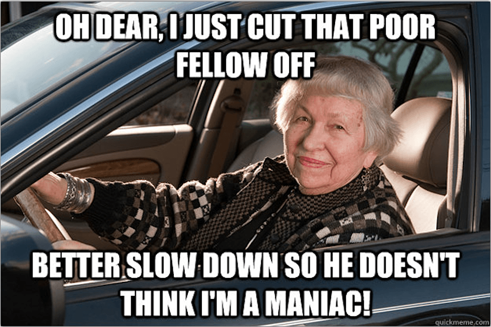 Ой, я только что переехала этого несчастного человека. Лучше я буду ехать помедленнее, а то он подумает, что я какая-то маньячка!