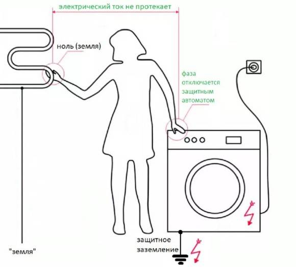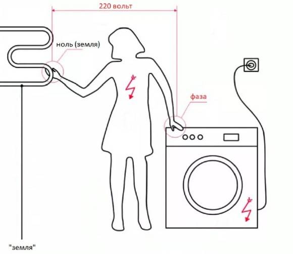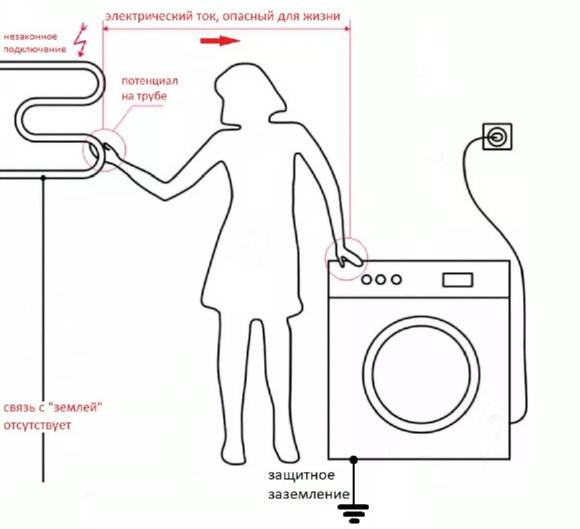 Вы касаетесь металлической трубы и заземленной стиральной машины. Возникает та самая разность потенциалов (с напряжением, опасным для жизни), только источником проблемы является не ваш электроприбор, а труба полотенцесушителя, находящаяся под напряжением.