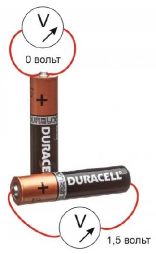 Для примера возьмем обычную пальчиковую батарейку. На ее плюсовом контакте есть потенциал значением приблизительно 1.5 вольт, на минусовом — 0 вольт. Если соединить измерительный прибор (мультиметр) с положительным контактом (используя оба провода), значение будет нулевым. А если произвести замер между «плюсом» и «минусом» — мы увидим на приборе напряжение 1.5 вольта.