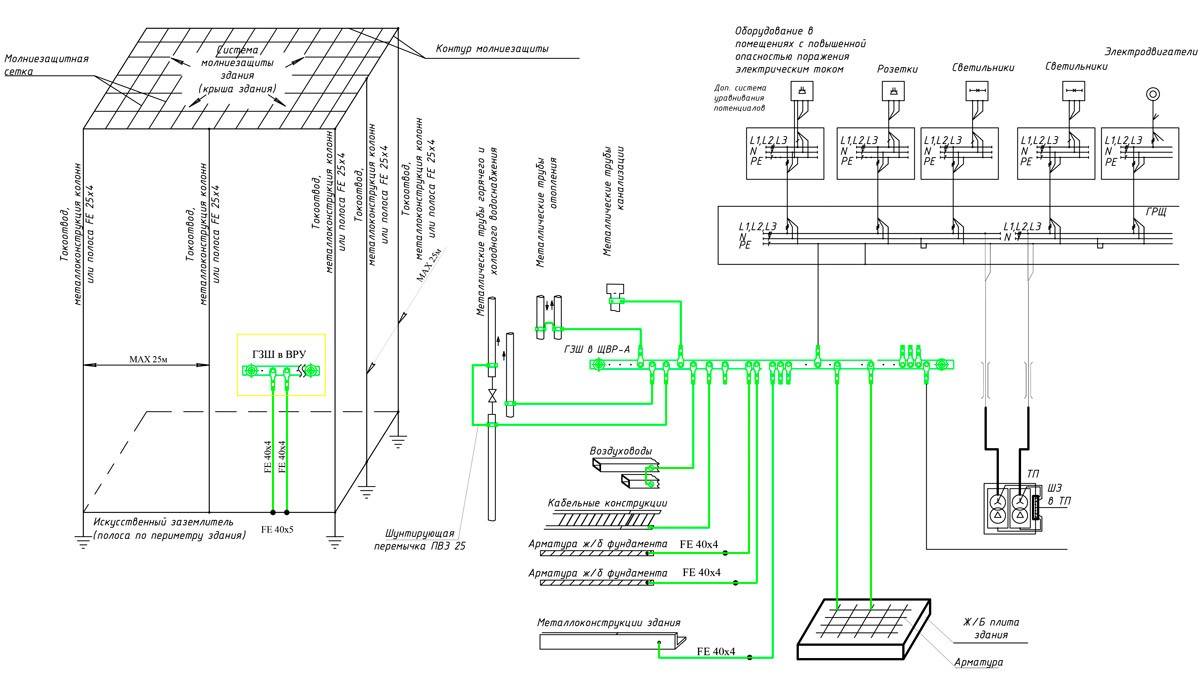 Каждое здание имеет вводное распределительное устройство (ВРУ), в нём устанавливают главную заземляющую шину (ГЗШ). Она подключается на контур заземления при помощи стальной полосы.