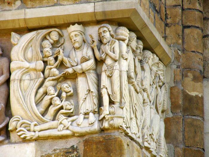 скульптуры в центре тимпана (внутренняя часть полукруглой арки,