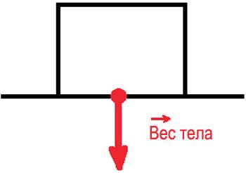 Сила, с которой тело действует на опору или вертикальный подвес называется весом тела (W). Это векторная, направленная величина. Атомы (или молекулы) тела отталкиваются от частиц основания в результате чего происходит частичная деформация, как опоры, так и объекта, возникают силы упругости и изменяется в некоторых случаях незначительно форма тела и опоры на макроуровне. Возникает сила реакции опоры, параллельно на поверхности тела также возникает сила упругости в ответ на реакцию опоры– это и есть вес. Вес тела (W) векторно противоположно направлен силе реакции опоры.