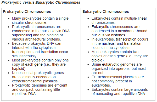 - Прокариоты также отличаются от эукариот тем, что они содержат только одну петлю стабильной хромосомной ДНК, хранящейся в области, называемой нуклеоидом, в то время как ДНК эукариот находится на сильно связанных и организованных хромосомах. Хотя некоторые эукариоты имеют сателлитные структуры ДНК, называемые плазмидами, их обычно рассматривают как функцию прокариот, и многие важные гены у прокариот хранятся на плазмидах.