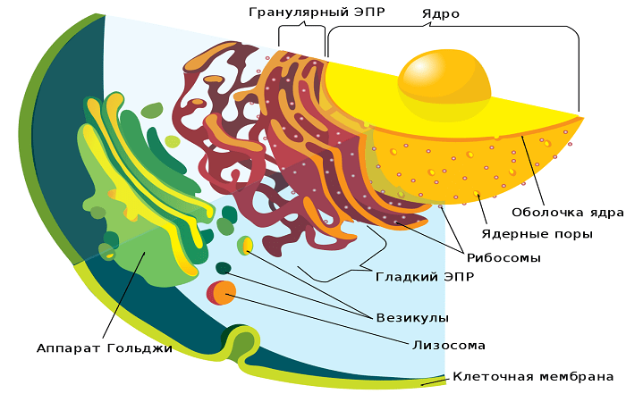 Прокариотические клетки транспортируют свои метаболиты через цитоплазму, но эукариотические клетки состоят из разных видов везикул для транспорта разных метаболитов. Синтез белка в эукариотических клетках происходит в рибосомах 80S, прикрепленных к ER. Синтезированные полинуклеотидные цепи входят в ER. Свертывание белка и транспортировка в различные части клетки поддерживаются ER. Следовательно, ключевое различие между прокариотическими и эукариотическими клетками связано с наличием или отсутствием ядра и мембраносвязанных органелл.