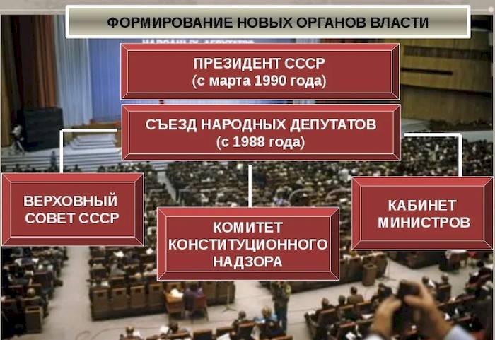 Вновь избранные депутаты предложили учредить новую должность – президент СССР. В 1990 году этот пост был предложен М. С. Горбачеву, который при этом продолжал оставаться генеральным секретарем ЦК КПСС. Фактически произошел переход к так называемому «социалистическому правовому государству». М. С. Горбачев инициировал реформу исполнительной ветви власти: создавался Кабинет Министров, который переподчинялся напрямую президенту государства.