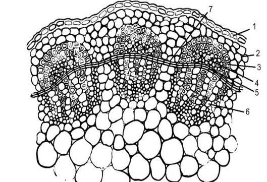 Рисунок 2: Камбий. 1 – эпидерма; 2 – паренхима; 3 – флоэмные волокна; 4 – флоэма; 5 – пучковый камбий; 6 – ксилема; 7 – межпучковый камбий.