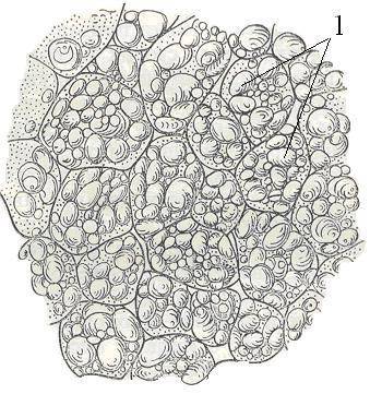Рисунок: Запасающая паренхима клубня картофеля. 1 – крахмальные зерна.