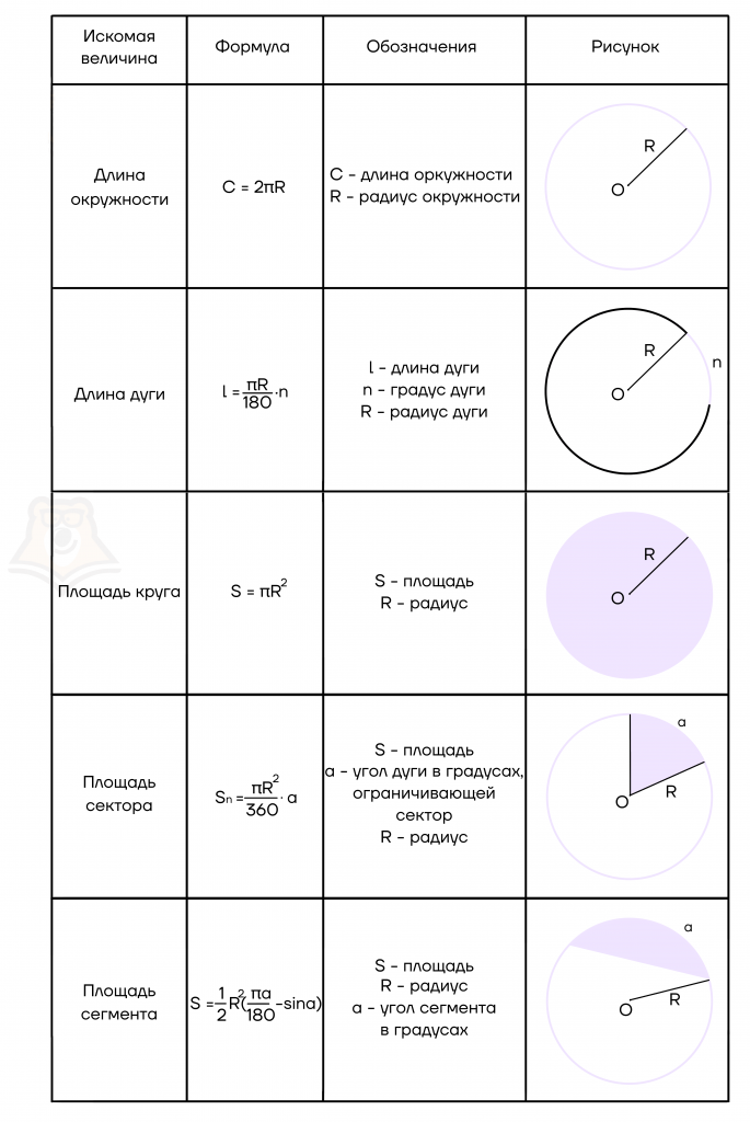 Мы рассмотрели окружности и круг, а также их элементы, однако ни одну задачу не получится решить без формул. Давайте рассмотрим их.