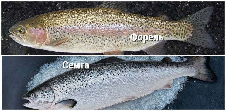 Форель часто путают с другими видами красной рыбы, чаще всего с семгой. Отличие семги от форели при покупке целой тушки заключается в следующем: семга может весить до 10 кг, в то время как средний вес форели — 1-3 кг, у форели более мелкая чешуя, усеченное рыло, хвост более вытянутый. Узнать рыбу при покупке филе довольно сложно, поэтому при выборе продукта следует отдавать предпочтение надежным производителям.
